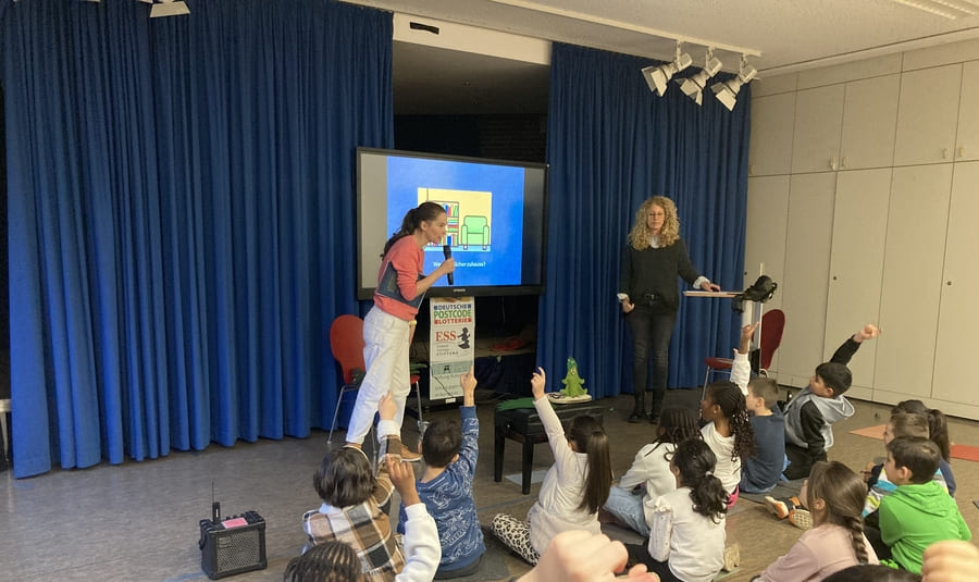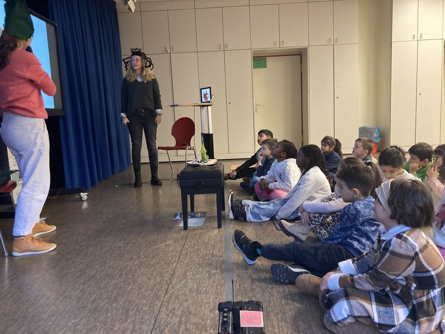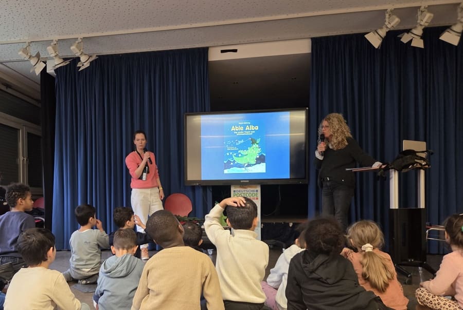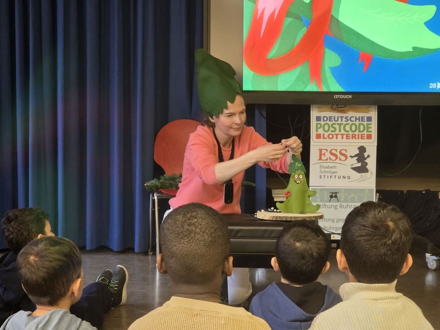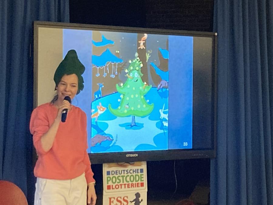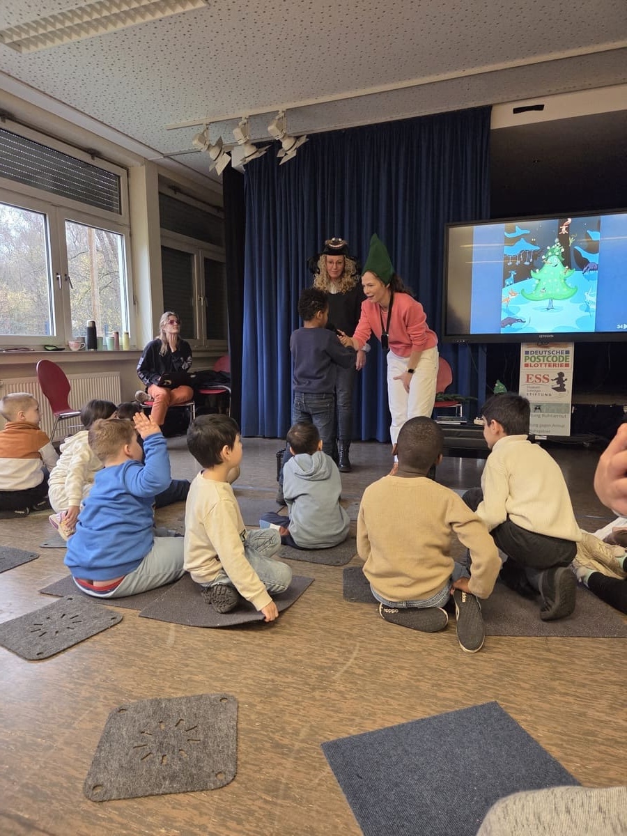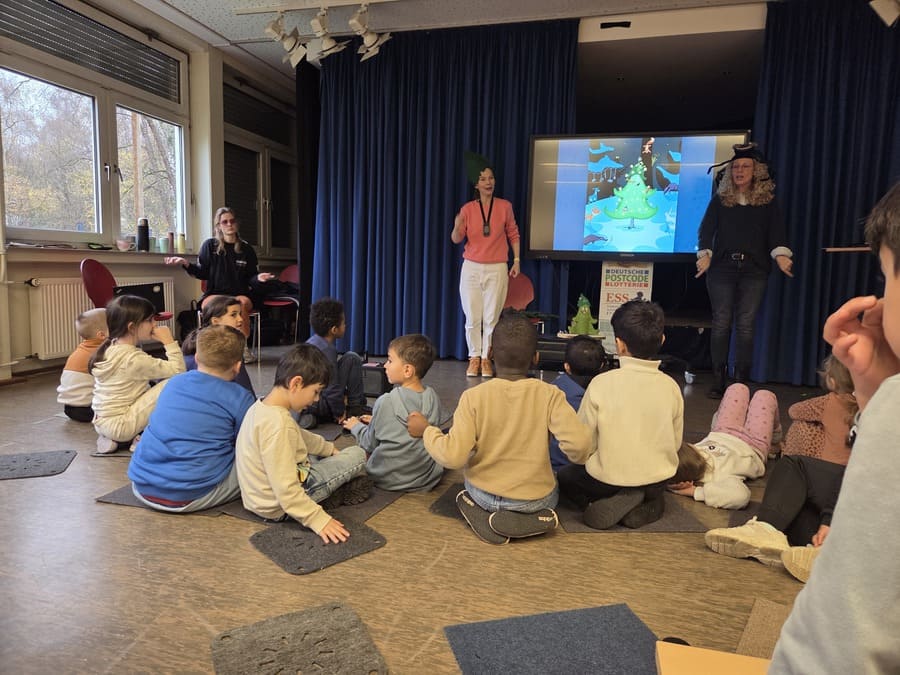 Am Dienstag, den 02.12.2025 bekamen die 1. Klassen unserer Schule die Gelegenheit, an einer Erlebnis-Lesung von Katrin Bühring und Maike Freiberg aus Abie Alba – Der große Traum vom Weihnachtsbaum teilzunehmen. Die Erdmännchenklasse, die Drachenklasse und die Fledermausklasse lernten Abie Alba und die Spinne Teggie kennen und begleiteten sie auf ihrem Weg durch eine Winternacht und tauchten ein in die Geschichte über Abies Traum ein Weihnachtsbaum zu werden. Die Lesung der beiden Präsentatorinnen wurde mithilfe von Bildern und ansprechende Requisiten unterstützt, weckte die Neugier Kinder und lud sie zum Mitmachen ein. Es wurde gesungen, gelacht und haptisch erlebt. Außerdem konnten die Kinder Abie Alba nach der Lesung künstlerisch gestalten. Alle hatten viel Spaß! Ein besonderer Dank geht an die beiden Präsentatorinnen, die auf ihrer Lesereise einen Stopp bei uns an der Westhausen Grundschule eingelegt haben sowie die Elisabeth Schnitger Stiftung, die Deutsche Postcode Lotterie und die Stiftung Ruhrarmut.